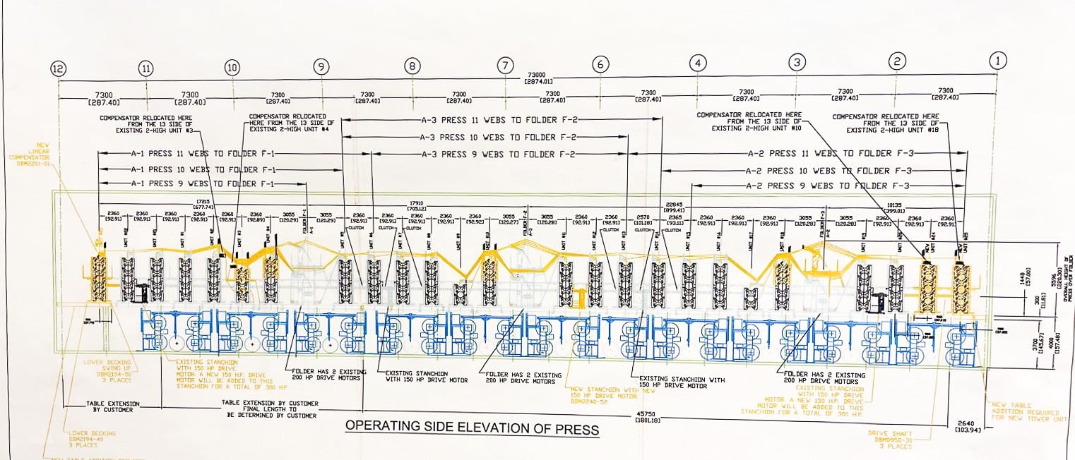 We have for sale a good condition Tensor T1400 press for newspaper or commercial printing. This particular press is 560mm cutoff. The specs are spelled out in a detailed layout drawing. I see 22 4 highs, 2 monos, 3 folders and 42 roll stands. The client indicated they are currently using it a a wide variety of work.
